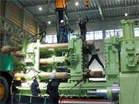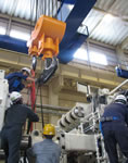 工場内にて、機械の解体・部品交換等の際、既存の天井クレーンでは能力がなく部品の交換・解体作業等が行えない時に、建屋内にショートブームクレーンを乗り入れ、天井クレーンの代わりに作業を行います。